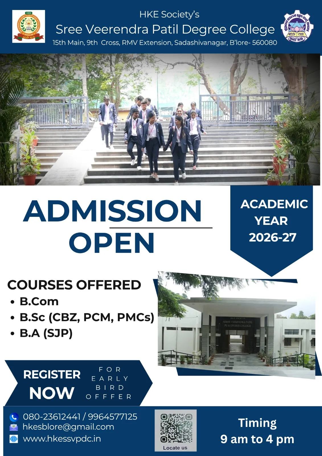 H.K.E.S. Sree Veerendra Patil Degree College of Science, Arts, Commerce and Management (SVP) is imparting education in the city of Bengaluru. The College aims at a holistic development of its students, fostering in them a spirit of academic excellence, Social concern and character formation, shaping them to become responsible citizens.